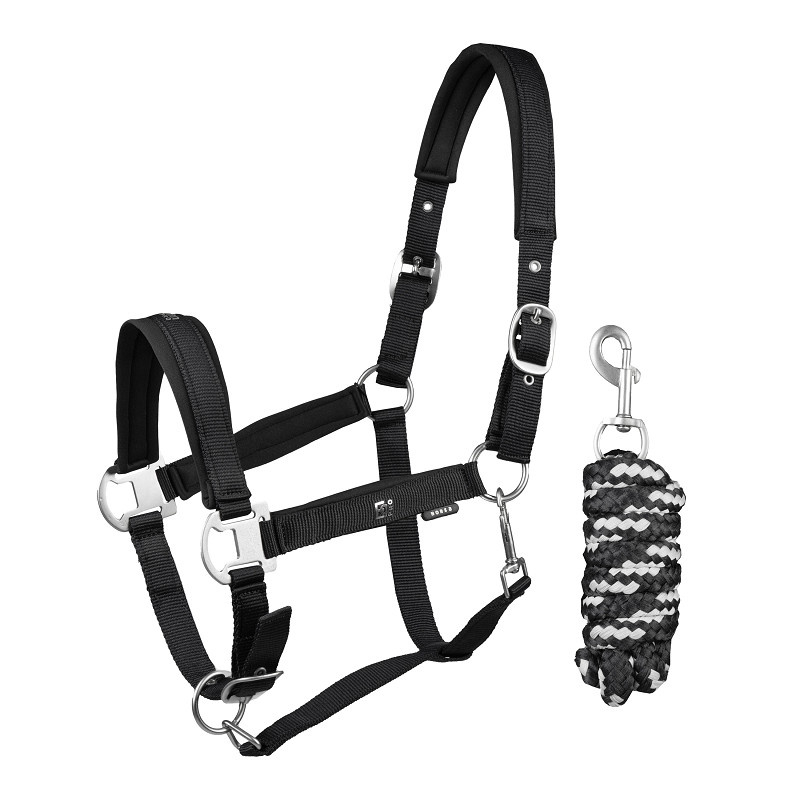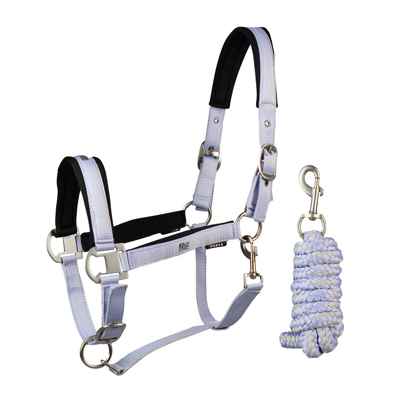 Halster met bijpassend halstertouw van 200 cm. Met zacht neopreen mesh onderlegd op kopstuk, bakstukken en neusriem. Afgewerkt met witte parelmoer accenten voor een verfijnde touch.